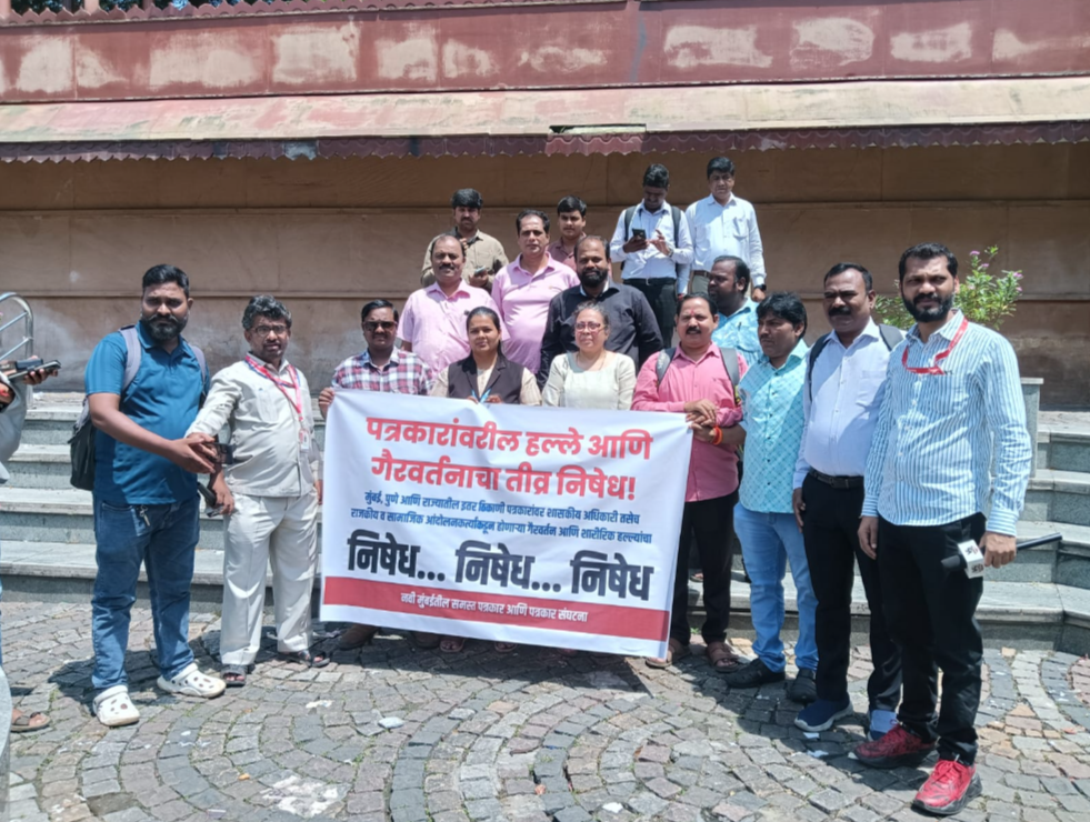उरण :- मुंबई, पुणे आणि महाराष्ट्रातील इतर भागांत पत्रकारांवर शासकीय अधिकारी, राजकीय नेते तसेच सामाजिक आंदोलनकर्त्यांकडून होणारे गैरवर्तन आणि शारीरिक हल्ले थांबवण्यासाठी नवी मुंबईतील पत्रकारांनी जोरदार निषेध आंदोलन केले. वाशी येथील छत्रपती शिवाजी महाराज चौकात एकत्रित झालेल्या प्रिंट, इलेक्ट्रॉनिक आणि डिजिटल मीडियातील पत्रकार, फोटो जर्नालिस्ट, व्हिडिओ जर्नालिस्ट आणि संपादकांनी या घटनांचा तीव्र निषेध नोंदवला. आंदोलनात सहभागी झालेल्या पत्रकारांनी घोषणाबाजी करत पत्रकारांच्या हक्कांसाठी एकजुटीने आवाज बुलंद केला आहे. या आंदोलनात पत्रकार सर्वस्वी विश्वरथ नायर, सुदिप घोलप, अनंत मिस्त्री, नागमनी पांडे, राजेंद्र बोडके, सुनील तावडे, विठ्ठल दळवी, दिपक सोनवणे, सनी मेहरोल, पुरषोत्तम कनोजीया, कासीम सय्यद, फोरम जोशी, साईनाथ भोईर, सुमित रेनोसे, अथर्व रणदिवे, समीर शेख, प्रकाश शिंदे, दीपक कांबळे, फारुख सय्यद, भरतकुमार कांबळे व इतर पत्रकार उपस्थित होते.