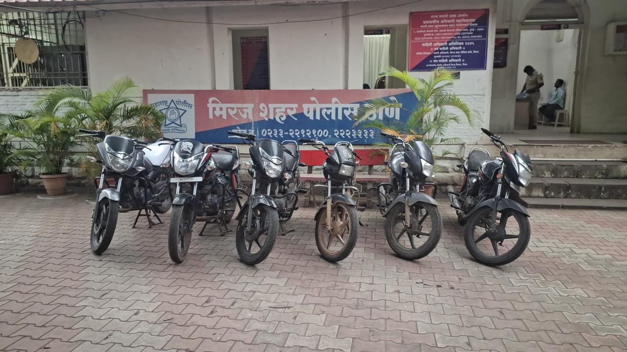 मिरज:- मिरज शहर पोलीस ठाण्याच्या गुन्हे प्रकटीकरण पथकाने मोठी कारवाई करत अट्टल दुचाकी चोरटा अजय बाळासो पटकारे (वय 43, रा. मिचारे गल्ली, सदर बाजार, कोल्हापूर) याला अटक केली असून त्याच्याकडून तब्बल ७ मोटारसायकली, किंमत २ लाख ३० हजार १०० रुपये, हस्तगत करण्यात आल्या आहेत.