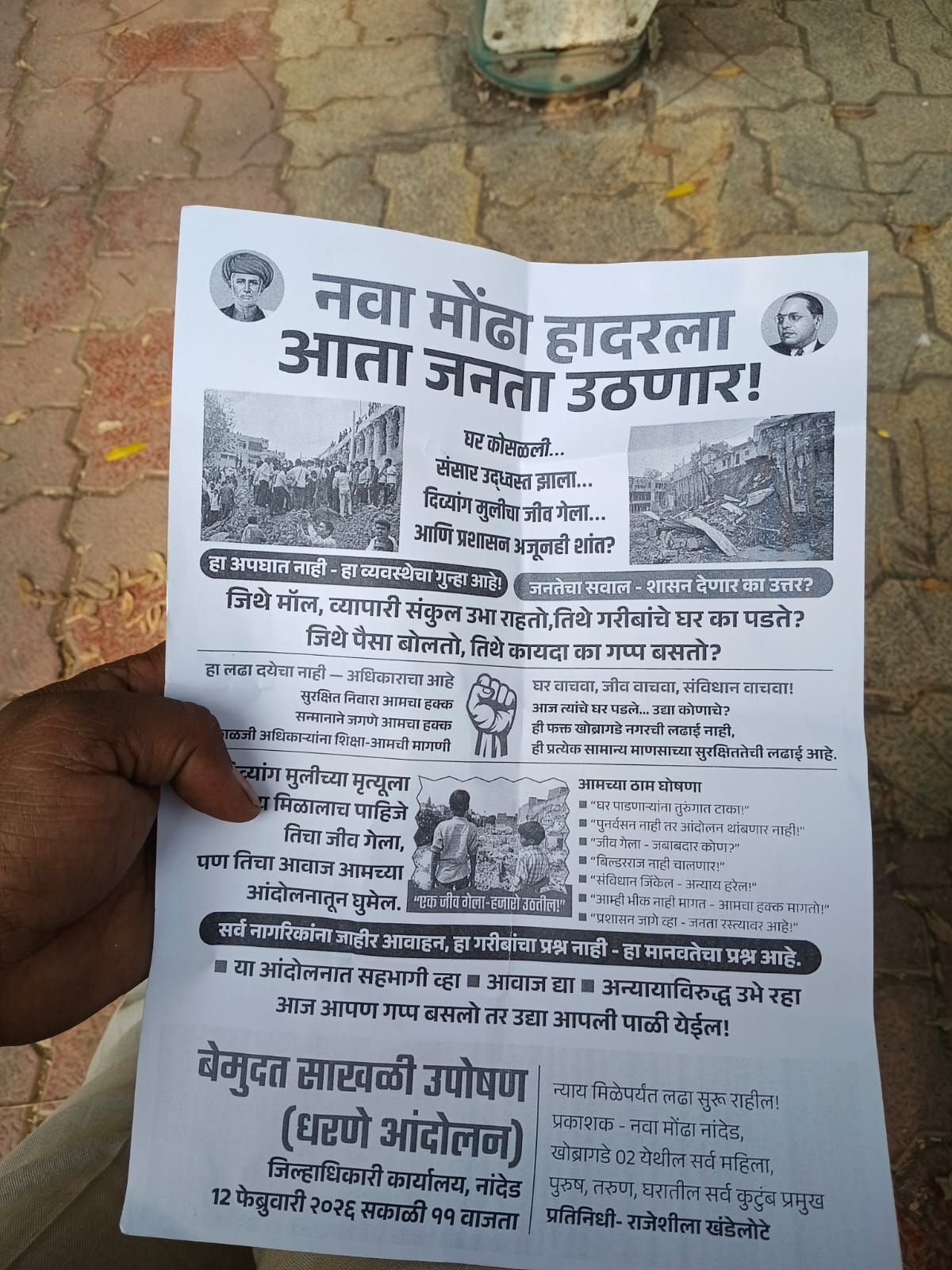नांदेड: – “जिथे मॉल आणि व्यापारी संकुल उभे राहते, तिथे गरिबांचे घर का पडते?” असा संतप्त सवाल करत खोब्रागडे नगरवासीयांनी प्रशासनाविरुद्ध एल्गार पुकारला आहे. नव्या मोंढा भागातील व्यापारी संकुलाच्या कामामुळे एका गरीब कुटुंबाचे घर कोसळून त्यात एका दिव्यांग मुलीचा दुर्दैवी मृत्यू झाल्याची धक्कादायक घटना घडली आहे. या घटनेच्या निषेधार्थ आणि न्यायाच्या मागणीसाठी १२ फेब्रुवारी २०२६ पासून नांदेड जिल्हाधिकारी कार्यालयासमोर बेमुदत साखळी उपोषण व धरणे आंदोलन सुरू करण्यात आले आहे.