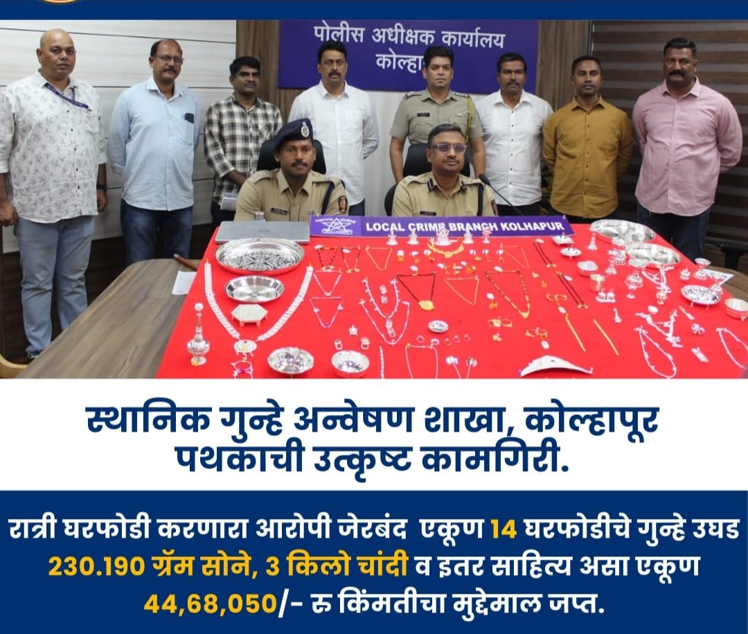 कोल्हापूर :- कोल्हापूर शहर आणि लगतच्या उपनगरांमध्ये धुमाकूळ घालणाऱ्या एका सराईत घरफोड्याला स्थानिक गुन्हे अन्वेषण शाखेने (LCB) मोठ्या शिताफीने अटक केली आहे. या कारवाईमुळे करवीर पोलीस ठाण्यांतर्गत असलेले तब्बल १४ घरफोडीचे गुन्हे उघडकीस आले असून, आरोपीकडून ४४ लाख ६८ हजार ०५० रुपये किमतीचा मुद्देमाल जप्त करण्यात आला आहे. स्थानिक गुन्हे अन्वेषण शाखेचे पोलीस निरीक्षक सुशांत चव्हाण यांच्या मार्गदर्शनाखाली पथक तपास करत असताना, गुप्त बातमीदाराकडून माहिती मिळाली की एक इसम चोरीचे दागिने विकण्यासाठी उजळाईवाडी परिसरात येणार आहे. त्यानुसार २७ जानेवारी २०२६ रोजी भारती विद्यापीठ परिसरातील हायवे रोडवर सापळा लावून प्रताप सुरेश कदम (वय ३१, रा. पाचगाव, मूळ रा. शिरोली एम.आय.डी.सी.) याला ताब्यात घेण्यात आले. आरोपींनी पायी फिरून बंद घरे लक्ष्य तपासामध्ये धक्कादायक माहिती समोर आली आहे. आरोपी प्रताप कदम हा कोणताही कामधंदा करत नव्हता. तो गेल्या तीन वर्षांपासून पाचगाव परिसरात भाड्याने राहत होता. रात्रीच्या वेळी पायी चालत जाऊन तो उपनगरातील बंद असलेली घरे हेरायचा आणि तिथे घरफोडी करायचा. गेल्या दोन वर्षांपासून त्याने अशा अनेक घटनांना अंजाम दिल्याचे तपासात निष्पन्न झाले आहे.