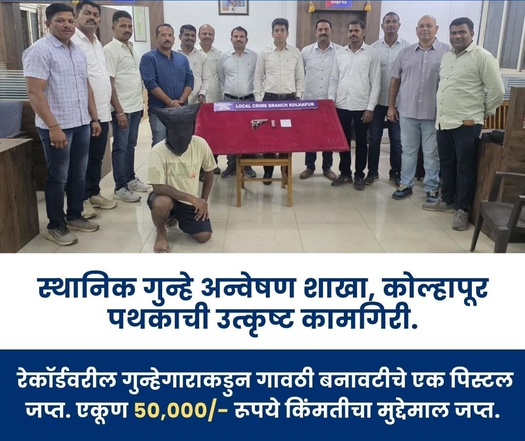 कोल्हापूर:- जिल्हयातील बेकायदेशीर हत्यारे बाळगणाऱ्यांविरुद्ध स्थानिक गुन्हे अन्वेषण शाखेने (LCB) धडक कारवाई सुरू केली आहे. २३ फेब्रुवारी २०२६ रोजी पोलिसांनी सापळा रचून रेकॉर्डवरील एका गुन्हेगाराला ताब्यात घेतले असून, त्याच्याकडून ५०,००० रुपये किमतीचे एक गावठी बनावटीचे पिस्तूल आणि जिवंत काडतूस जप्त करण्यात आले.