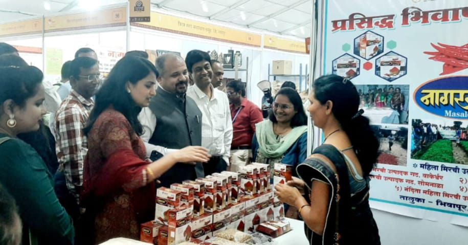 फोटो – समुहाच्या मिरची स्टॉलला भेट देतांना श्रावण हार्डीकर, मुख्य कार्यकारी अधिकारी सौम्या शर्मा, प्रकल्प संचालक (जिग्रावियं) सौ. वर्षा गौरकार